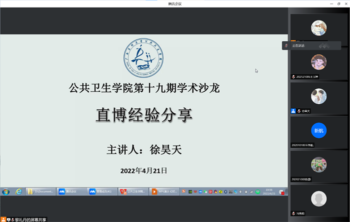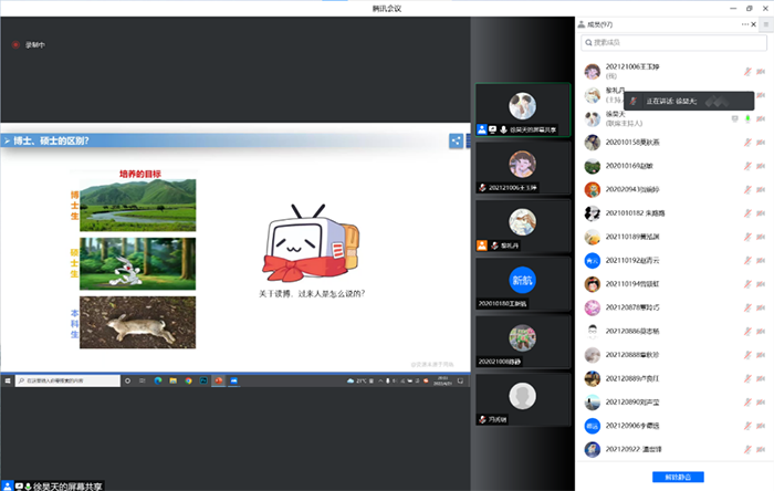 当前位置:学生工作为了更好地向研究生们传授直博经验,2022年4月21日20:00,快看漫画 研究生会成功邀请到2020级硕士研究生徐昊天为大家分享直博经验,为同学们未来申请直博提供了宝贵的参考和指导意见,快看漫画 研究生辅导员蒋家晓老师参与本次活动。活动由黎礼丹同学主持。
