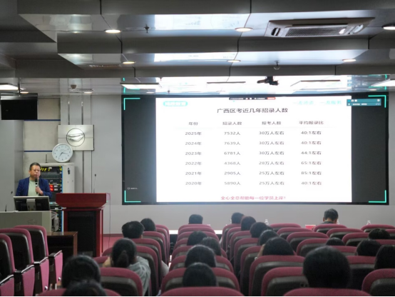 汤丰宁首先结合往届学生考公考编的情况分享了现阶段的就业形势和就业重点工作。随后,宋秉桂老师围绕2026年广西区考动态、笔试面试核心考情、选调生的报考条件与发展前景,以及区内各城市的考情差异等同学们关切的问题,进行了系统而全面的梳理与讲解。整场讲座内容“干货”满满,为备考公务员的同学指明了方向,提供了宝贵的备考信息,同学们纷纷表示受益匪浅,对后续的复习规划更加清晰。